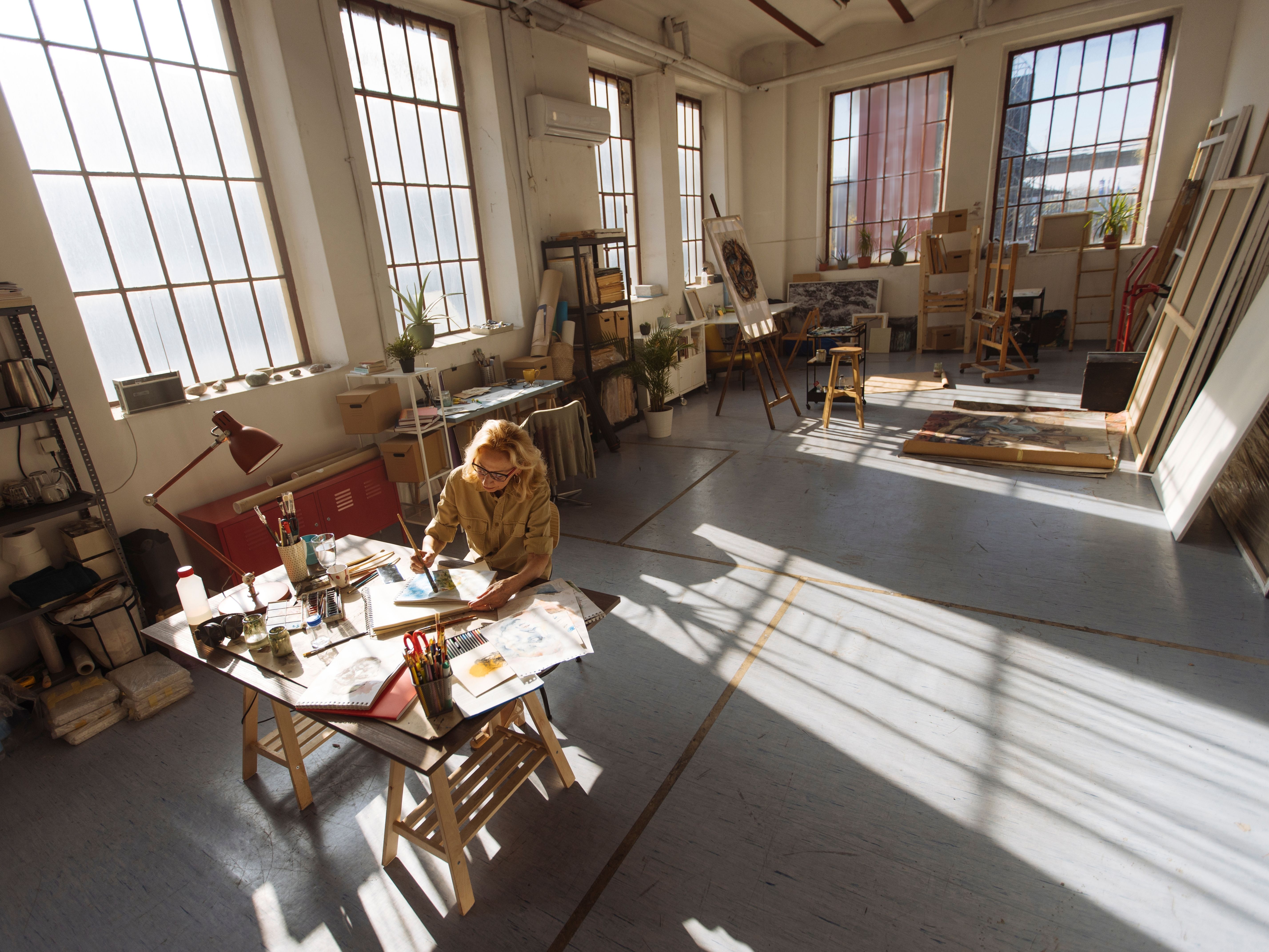 The studio is bathed in golden morning light that pours through expansive industrial windows, casting soft shadows across canvases in progress and jars of well-worn brushes. The high ceilings and open layout give the space a sense of calm and clarity, while the exposed brick and weathered wood floors whisper stories of decades past.